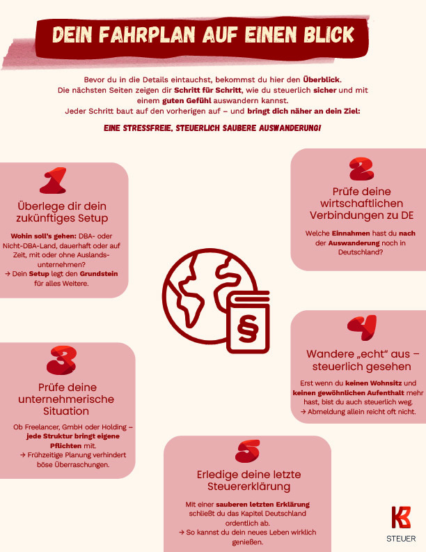 Du möchtest auswandern – und wünschst dir, dass alles steuerlich von Anfang an richtig läuft? Dieser Fahrplan zeigt dir Schritt für Schritt, wie du deine Auswanderung gut planst, steuerlich absicherst und dabei sorgenfrei bleibst.